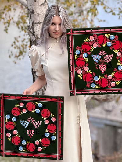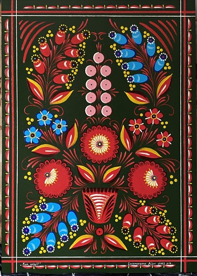 Миколаївка… Миколаївський розпис – унікальна техніка українського декоративно – прикладного мистецтва Січеславщини. Назва має прив’язку до мистецького села Миколаївка, що розкинулося неподалік од містечка Самар. Загалом, Миколаївський розпис поширений на Січеславщині (колись – Катеринославщина). Щодо часу започаткування існують різні думки, щонайменше – це близько двох століть, мо й більше… Вік найстарішої скрині понад двісті років. Використовують при письмі: переважно, сім кольорів, темно – зелене і жовтогаряче тло та квіти, які малюються проти годинникової стрілки на скринях та побутових речах. Розпису питомий глибинний символізм, то мова архетипів, яка є мовою первісних образів. Мисткині докладають немало зусиль, щоб воскресити призабутий вид народної творчості.