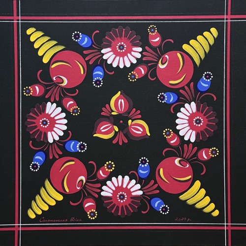 Майстриня цього розпису Діна Соломоненко розповідає: «Основні кольори – червоний, білий, жовтий, синій, коричневий, краплаковий, блакитний. Головні мотиви – садові та лугові квіти(жоржини, айстри, тюльпани, ромашки, волошки). Властивим візерункам є зображення бутонів та ажурного листя. Застосовуємо стилізовані знаки та символи – Небо, відродження Світу, рослини, зернятка… Саме зображення наноситься кількома шарами фарб, об’єм досягається контрастом кольорів. Також має бути чергування контрасту, світла та тіней… Заповнюємо площину, порядок зображення складників такий: вазони, дерево життя, квіти, листя… Розпис виконується рваним мазком. Мазки – це й зернятка, видовжені завиточки, спіральні завитки…».
